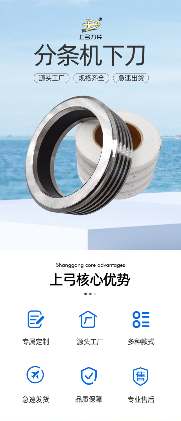 分條機(jī)下刀是分切機(jī)下刀軸上的刀片是和上刀配合,用剪刀式剪切的原理完成分切。 分條機(jī)下刀片規(guī)格主要如下 分條機(jī)下刀的材質(zhì)以9CrSi、SKD-11、DC53為主 9CrSi材質(zhì)正常在洛氏硬度56-58°這款材質(zhì)屬于一種低廉價(jià)格的材質(zhì),針對(duì)一些壽命、分切要求不高的客戶又或者是一些經(jīng)銷商設(shè)備廠商客戶,但是這款材質(zhì)是目前比較常用的材質(zhì),主要是因?yàn)橄碌镀侵黄鸬焦疃▽?,輔助分切的作用。 SKD-11材質(zhì)正常在洛氏硬度58-60°這款材質(zhì)屬于一種中檔通用型材質(zhì),針對(duì)的是有一定要求的客戶。